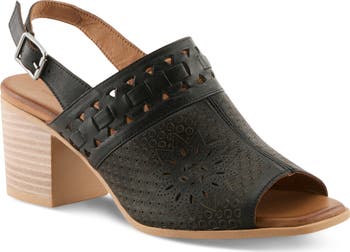 Decorative stitching and geometric perforations amplify the dimension of a slingback leather sandal lofted by a faux-stacked block heel.