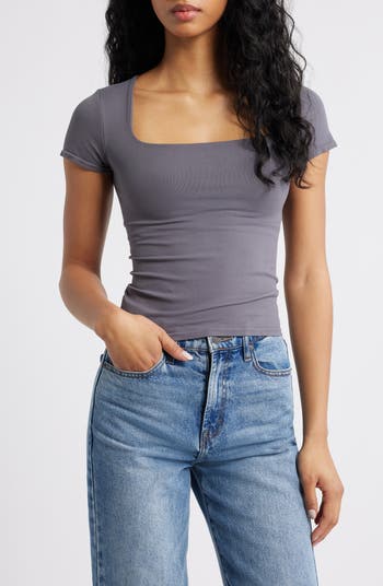Fall for the close fit of this stretchy cropped top designed with a square neck and abbreviated sleeves.