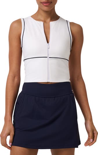 Sport-driven and close fitting, this zip-front tank features stretchy knit construction that moves easily through every match.