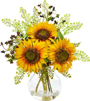 With cheerful colors and a realistic feel, this sunflower artificial arrangement features three bright yellow sunflower blooms that are interspersed between greenery, adding to the color and volume of this piece. Coming in a beautiful glass vase, this would be the perfect piece to add to your office reception desk to offer a warm welcome to any visiting guests.