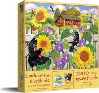 Immerse yourself in the vibrancy of nature with SunsOut's Sunflowers and Blackbirds 1000 Piece Jigsaw Puzzle featuring the enchanting artwork of renowned artist, Rosalind Solomon. The captivation of a serene countryside scene nestled with sunflowers and blackbirds comes alive in intricate details and vivid colors on each of the finely crafted puzzle pieces. Made in the USA, each puzzle piece, precisely cut from high-quality recycled cardboard, interlocks with ease offering a delightful challenge that diminishes frustration and enhances the puzzle-solving experience. SunsOut further supports sustainability with their use of soy-based inks and recycled materials for both the puzzle and its stunning display box, not only giving you a masterpiece for your collection but also allowing you to support a woman-owned small business committed to eco-friendly practices. SunsOut pledges customer satisfaction with a worry-free guarantee, resolving any issues with missing or damaged pieces promptly. This jigsaw puzzle serves as a perfect gift that offers endless entertainment and artistic admiration, connecting family and friends through shared exploration and achievement. Experience more than just a puzzle with Sunflowers and Blackbirds, an experience that engages your senses, supports sustainable practices, and enriches your leisure time.