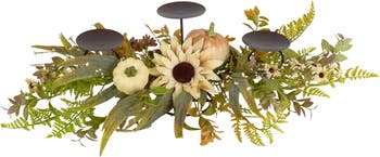 Bring the warmth of Autumn indoors with this Fall harvest triple pillar candleholder centerpiece. Measuring 28 inches wide, this elegant Fall candleholder centerpiece features a three-tier design with round metal dish holders crafted to display up to three pillar candles (candles not included). The arrangement showcases mixed Fall greenery, including fern branches, sunflowers, daisy flowers, mini white berries, and mini pumpkin accents, nestled among vibrant Autumn foliage. Built on a sturdy circular brown metal base, this harvest-themed candleholder is perfect for decorating mantels, dining tables, or entryway displays. Ideal for creating a Thanksgiving table centerpiece, this autumn floral candleholder adds a cozy seasonal touch to any home décor. Display it alone or pair it with coordinating Fall wreaths, garlands, or harvest decorations to complete your festive look. Perfect for Thanksgiving decorating or all Autumn long. Product Features: 3-tier design with round metal pillar holders Showcases mixed fall greenery paired with sunflower, daisy, and pumpkin accents Circular brown metal base Holds 3 pillar candles - not included Recommended for indoor use only Dimensions: 8.5"H x 28"W x 15"D Material(s): metal/polyester/plastic/foam Note: candles are not included