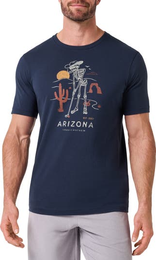 The brand’s humor swings big with a skeleton graphic heading straight for the nine on the front of this all-cotton T-shirt.