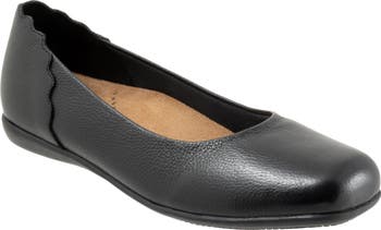 A scalloped heel counter adds subtle charm and dimension to a streamlined leather flat featuring premium underfoot cushioning and a flexible sole.