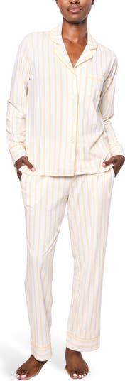 Cheerful yellow stripes sweeten mornings and nights in these buttery-soft pima cotton pajamas polished off with smooth piping, curved lapels and a chest pocket.