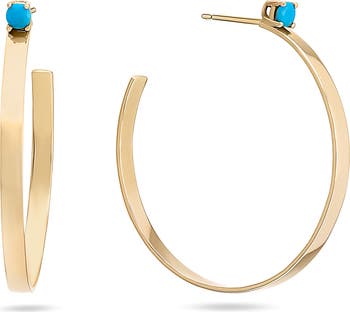 Prong-set turquoise top 14-karat-gold hoops to mix cool color and warm shine.
