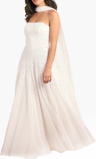 The Sunrise Sequin Strapless Cape Gown. This elegant strapless gown is embellished with shimmering sequin dot motifs arranged in softly fading linear bands for a luminous finish. Designed with a delicately gathered tulle cape at the back, the flowing silhouette creates refined drama for evening occasions. Perfectly paired with a matching scarf.