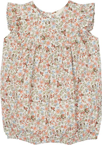 This baby romper showcases a colorful botanical print in soft orange, green, and blue tones on a cream background. Designed with ruffled flutter sleeves and a gently gathered yoke, it offers a relaxed, airy fit, making it ideal for warm-weather outings or playtime. Fabric Care 100% Cotton Machine Wash Cold | Line Dry | Do Not Bleach