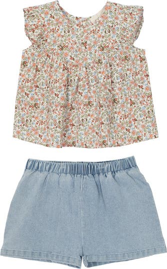 This girl's 2-piece set includes a cotton lightweight colorful botanical top with soft ruffled sleeves. The relaxed, flowy design pairs perfectly with the light blue denim shorts featuring an elastic waistband for comfort and easy wear. A stylish and versatile outfit for everyday activities or outings. Fabric Care 100% COTTON / 80% COTTON 18% POLYESTER 2% SPANDEX Machine Wash Cold | Line Dry Do Not Bleach