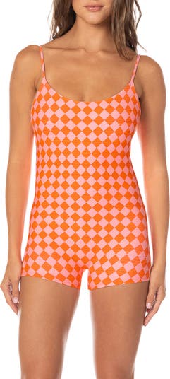 Seek out the sunshine and waves in this romper-inspired one-piece swimsuit made with a deeply dipped back and extended legs.