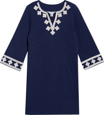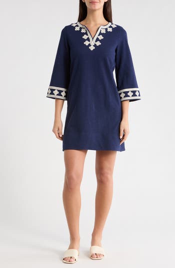 Bordered-off floral embroidery trims the neckline and cuffs of this resort-ready minidress cut from slubbed cotton jersey.