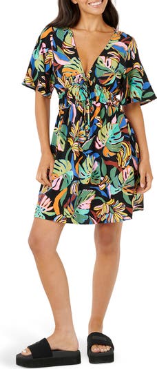 A vibrant floral print channels laid-back resort energy in this flowy sundress styled with a pretty ladder lace and breezy high-low hem.