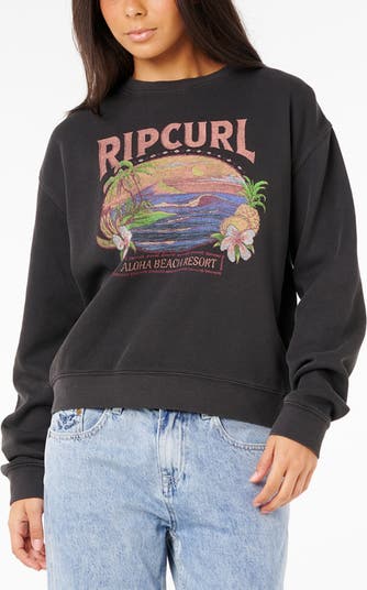 Dream of tropical getaways as you snuggle up in a cozy cotton-fleece sweatshirt featuring a vintage-inspired graphic of cresting waves and sunny palm trees.
