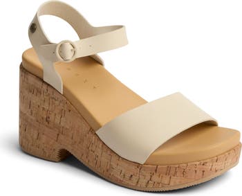 A chunky cork platform elevates this faux-leather sandal cushioned for comfort wherever you end up walking or dancing.