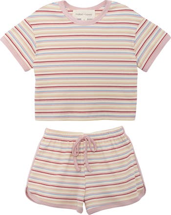 Brighten up her days with this colorful and comfortable outfit. Crafted from a soft, stretchy ribbed knit, this two-piece set is designed to move with her during play or relaxation. It features playful multi-color horizontal stripes, accented by delicate light pink trim.