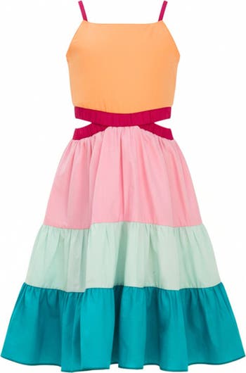 Bursting with color and playful energy, this tiered sundress is made for sunshine-filled days. The vibrant colorblock design and breezy silhouette create a fun, feel-good look she’ll love wearing from vacations to everyday outings.