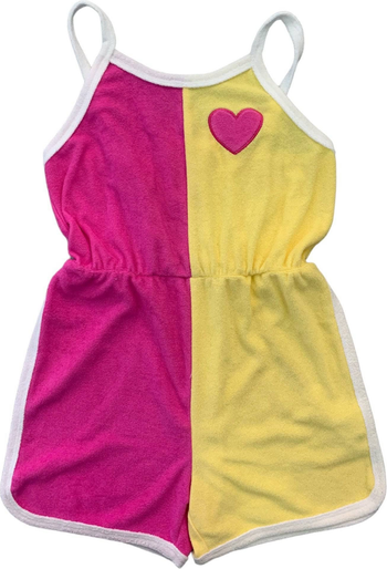 Bright and playful romper in a color-blocked pink and yellow design with a cute heart applique. Features adjustable spaghetti straps, an elastic waistband, and contrasting white trim for a sporty yet stylish look. Perfect for sunny days, beach outings, or adding a pop of color to casual wear.