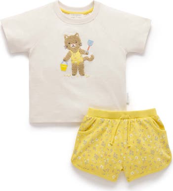 Our practical two piece Sunshine Set makes a perfect everyday outfit. Featuring a jersey tee with fluffy cat applique, and comfy shorts in a sweet all over floral print. Made from soft, easy care 100% Cotton, this is a roomy outfit that is comfy for play.