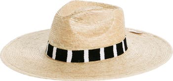 Bold stripes enliven the woven band that surrounds the crown on this classic straw hat crafted from palm fronds and styled with a wide, shade-providing brim.