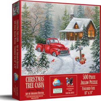 Christmas Tree Cabin 500 pc Jigsaw Puzzle by SunsOut- 500 Piece Jigsaw Puzzle - Completed Size: 18" x 24" - Puzzle Artist: Abraham Hunter - SunsOut Puzzles are Proudly Made in the USA - Interlocking Pieces and Durable Construction: SunsOut jigsaw puzzles feature interlocking pieces that fit securely, making assembly easier and reducing frustration. Made with high-quality recycled cardboard, they are durable and to easy to work with - Warranty: SunsOut puzzles being made in the USA ensures high manufacturing standards include a worry-free guarantee ensuring any issues with missing or damaged pieces are resolved, reflecting SunsOut's commitment to quality and customer service. - Eco-Friendly Materials: SunsOut puzzles are crafted with eco-friendly materials