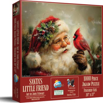 Santa's Little Friend 1000 pc Jigsaw Puzzle by SunsOut - 1000 Piece Jigsaw Puzzle - Completed Size: 20" x 27" - Puzzle Artist: John Stewart - SunsOut Puzzles are Proudly Made in the USA - Interlocking Pieces and Durable Construction: SunsOut jigsaw puzzles feature interlocking pieces that fit securely, making assembly easier and reducing frustration. Made with high-quality recycled cardboard, they are durable and to easy to work with - Warranty: SunsOut puzzles being made in the USA ensures high manufacturing standards include a worry-free guarantee ensuring any issues with missing or damaged pieces are resolved, reflecting SunsOut's commitment to quality and customer service. - Eco-Friendly Materials: SunsOut puzzles are crafted with eco-friendly materials