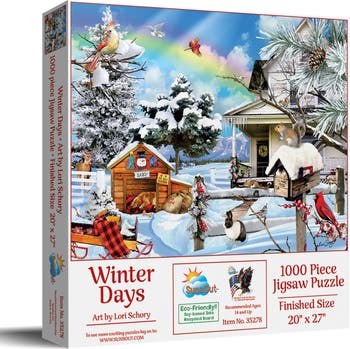 Winter Days 1000 pc Jigsaw Puzzle by SunsOut- 1000 Piece Jigsaw Puzzle - Completed Size: 20" x 27" - Puzzle Artist: Lori Schory - SunsOut Puzzles are Proudly Made in the USA - Interlocking Pieces and Durable Construction: SunsOut jigsaw puzzles feature interlocking pieces that fit securely, making assembly easier and reducing frustration. Made with high-quality recycled cardboard, they are durable and to easy to work with - Warranty: SunsOut puzzles being made in the USA ensures high manufacturing standards include a worry-free guarantee ensuring any issues with missing or damaged pieces are resolved, reflecting SunsOut's commitment to quality and customer service. - Eco-Friendly Materials: SunsOut puzzles are crafted with eco-friendly materials