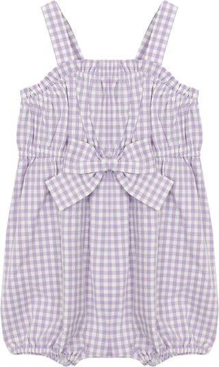 - This adorable baby romper features a classic lavender and white gingham pattern on a soft, breathable fabric. The romper is designed with a an oversized front bow for added charm. outings and playdates. Fabric Care 100% COTTON Machine Wash Cold