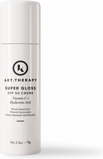 Akt Therapy Super Gloss SPF 50 is the ultimate lipid rich, fragrance-free sunscreen with Vitamin C, hyaluronic acid and SPF 50. It's lightweight texture serves as a primer, moisturizer, and sunscreen, suitable for all skin tones with no white cast, pilling, or stickiness. For optimal finish use over a light face oil. This everyday sunscreen aids in combating hyperpigmentation, softening the appearance of wrinkles, promoting an even skin tone, preventing future sun damage, and delivering a radiant glow. Akt Therapy Super Gloss SPF 50 is fortified with zinc oxide that blocks both UVA and UVB rays, achieving a UV blocking of 96. 7%. A gentle and effective mineral sunscreen suitable for sensitive skin and acne-prone skin. Trust in the power of zinc oxide for a safe and reliable sun care routine.