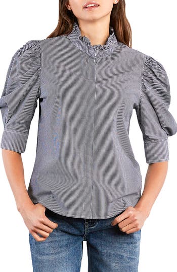 Decadent puff sleeves sweeten the silhouette of this polished striped shirt cut from crisp poplin.