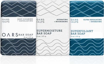 The key to balanced skin that looks and feels great? Exfoliate AND moisturize. Enter the Super Soap Trio. The Superfoliant Bar is our most exfoliating soap, meant for effectively removing stubborn dry, dead skin while you cleanse. Our Supermoisture Bar hails from the other end of the spectrum, intensely replenishing skin with moisture and softness. The Oars Bar with Blue Charcoal is for days (or body parts) where you just need a light grit. With their powers combined, you've got a recipe for successful showers.