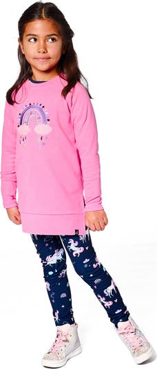 This tunic top is oh-so-sweet with an embroidered rainbow and heart motif. Detailed with long raglan sleeves and a round neckline, this tunic tee is made in soft jersey fabric and features a wide band hem with slit sides and embroidered accents on the chest. Pair it with allover printed leggings for a darling head-to-toe look!