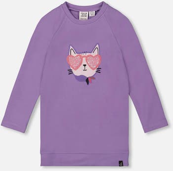 A cat wearing sparkling heart-shaped sunglasses add a touch of shimmer to this playful purple gray tunic top. In soft and stretchy jersey fabric, this darling tunic tee features long raglan sleeves, a round neckline, a wide band at the hem, and a sunglass-wearing kitty cat graphic on the chest.