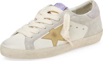 Signature scuffed-up detailing dirties a leather low-top sneaker styled with a shiny star and a lavender logo at the tongue.