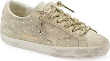 The label's signature handcrafted, scuffed-up kicks get a glammed-up refresh you can only get here in this suede version embellished with golden-tinsel laces and tiny faux-pearl studs.