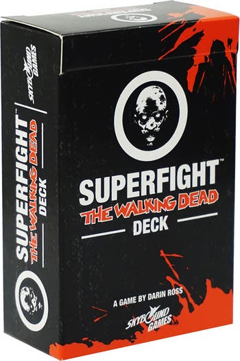 SUPERFIGHT: THE WALKING DEAD - From the creators of the Walking Dead franchise! All of your favorite Walking Dead survivors and villains have made their way into Superfight. With all new blood splattered cards and ten Walking Dead inspired locations and scenarios, this deck will take your fights to the darkest places they have ever been. “Featuring fan-favorites like Michonne, Rick and Glenn and not-so-favorites like The Governor with a couple of Walker character cards for good measure, this deck really stays true to the feel of the comic books (and the show). Unlike the Core Deck, it is much more serious in terms of attributes and scenarios, with many of them mentioning weapons or injuries. The cards themselves are marked with bloodstains, a trait that not only helps separate them from other decks but also adds to the ominous atmosphere of this expansion pack. That being said, the fact that the characters have such a serious feel to them makes for some hilarious fighters when combined with other decks.” (FROM “THERATHOLE.CA”) SUPERFIGHT is a game where you argue with your friends over ridiculous fights. The game is very simple. Players use the cards to create ridiculous fighters, and argue about which character would win in a fight. Then everyone around the table votes on the winner. As you can imagine, the fights are epic and hilarious. It’s fun for all ages and works for all kinds of players. The Superfighter at the end of the night is the player who won the most matches. GREAT FOR PARTIES & GAME NIGHT: Grab a group of 3 or more players for the most fun you’ll have arguing! Things can get hilarious when you have to defend your absurd fighters. Awesome to play with friends and family (depending on the deck you choose), games night, at a party, office party, sleepovers, birthdays, dinner parties or even in the park. Choose to have Mom as the judge! Or have 10 judges at the next drinking game! Watch how the game changes with different players.