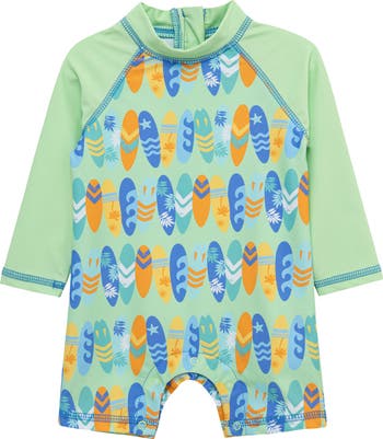 Watch them splash and play in this colorblocked one-piece swimsuit made with built-in UPF 50+ sun protection and long sleeves that block out the sand and surf.