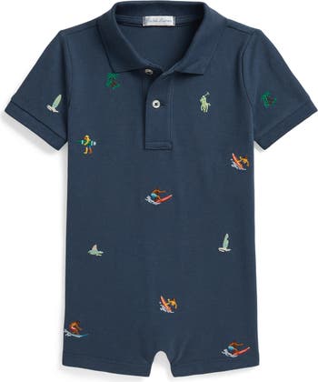 Baby will be ready for a sunny vacation in this piqué polo romper embroidered with surfers, palm trees, surfboards and shark fins.
