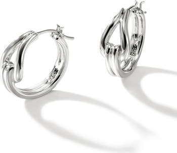 An undulate loop of sterling silver radiates natural shine in these slightly open, handcrafted hoop earrings.