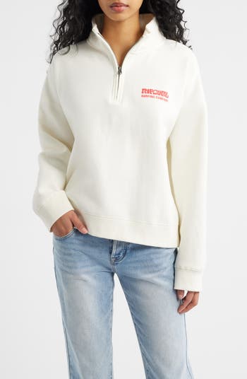 Puffy logos enhance the retro vibe of a slouchy quarter-zip sweatshirt that keeps you cozy when you leave the beach or the sun sets (whichever comes first).