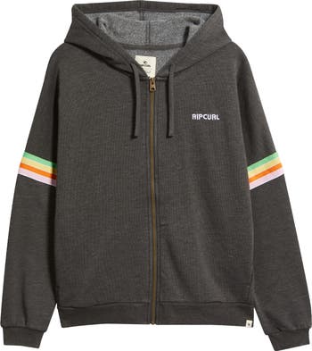 Sunset-hued stripes frame this soft cotton-blend fleece hoodie that keeps you cozy when the ocean breezes kick up.