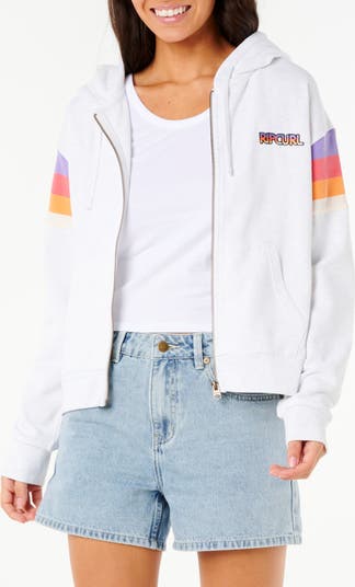 Sunset-hued stripes frame this soft cotton-blend fleece hoodie that keeps you cozy when the ocean breezes kick up.
