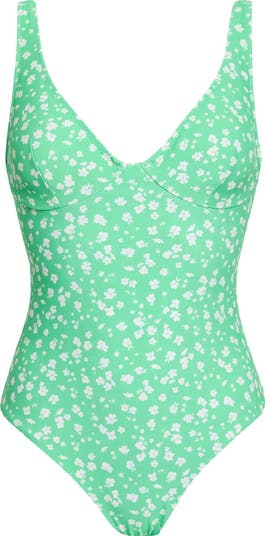 Creamy flowers sprinkle a beach-ready one-piece swimsuit featuring adjustable straps for a perfect fit.
