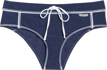 A rainbow logo tag sits at the waist of these sporty bikini bottoms designed with a drawstring at the waist.