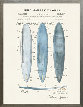 This vintage-inspired print, framed in a black wooden frame, features a surfboards patent. Sized at 16 inches by 20 inches, this made in the USA frame makes for a beautiful addition to any wall.
