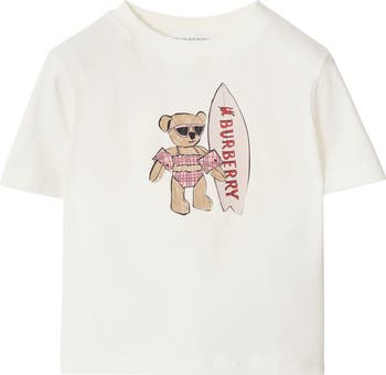 A crew-neck T-shirt in cotton jersey, printed with our beach-ready bear dressed in Burberry Check. The surfboard features our logo and Equestrian Knight Design. ||Rib-knit neckline|Press-stud shoulder|Printed Burberry lettering at front