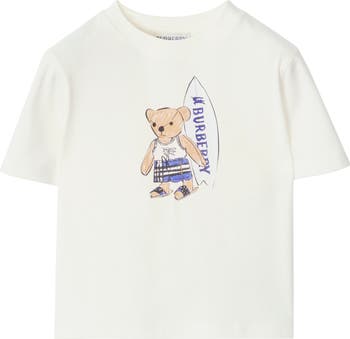 A crew-neck T-shirt in cotton jersey, printed with our beach-ready Thomas Bear. The surfboard features our logo and Equestrian Knight Design. ||Rib-knit neckline|Press-stud shoulder|Printed Burberry lettering at front