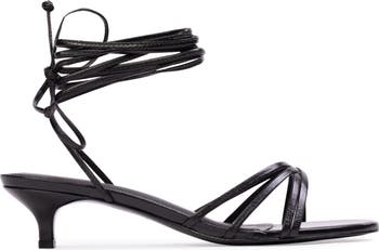 - Round toe strappy sandal with wrap up laces, set on a kitten heel