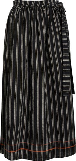 This gathered wrap skirt brings airy volume in a lightweight, hand-loomed cotton fabrication woven with softly graphic stripes popped with red bordering the hem.