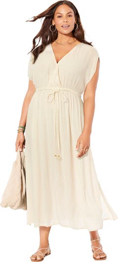 From sunrise beach walks at dawn to sunset parties at dusk, all you need is one stylish cover up dress to pull your poolside look together. This is that Dress. Styled with a surplice neckline with drawstring elastic waist, and a Hook-and-Eye closure.