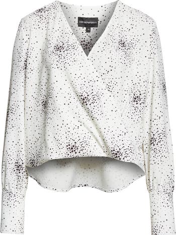 Perfect for work or casual occasions, this faux-wrap top is cut from stretch crepe fabric covered in a paint-splatter print. The surplice neckline and balloon sleeves shape a soft silhouette, while the elongated cuffs lend polish.